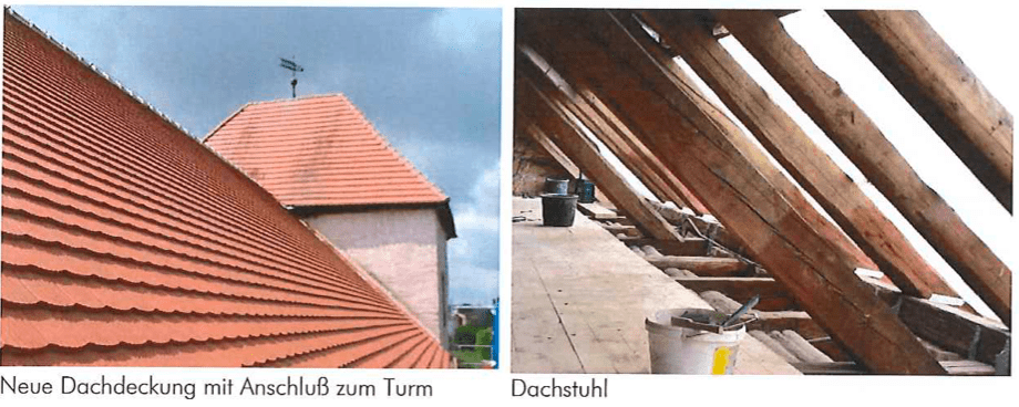 Die Südseite des Kirchendaches ist fertig gedeckt. Aufgrund der Schäden am Holz war die Sanierung auf dieser Seite besonders dringend notwendig. Die Zimmerleute sind fertig, die letzten Putzarbeiten am Mauerwerk werden in den nächsten Tagen abgeschlossen sein. Die Nordseite des Daches soll in einem nächsten Bauabschnitt saniert werden.